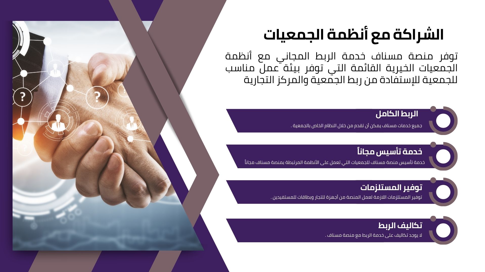 تعمل منصة مسناف على توفير خدمة الربط بين الجمعيات الخيرية والمتاجر التجارية بالشراكة مع أنظمة الجمعيات الخيرية القائمة ، وتوفير بيئة عمل مناسبة للجمعية عن طريق العديد من أدوات الربط بأستخدام API ، بحيث يمكن للجمعية تنفيذ جميع العمليات التي ترغب بها عن طريق النظام الذي تعمل عليه حالياً دون العمل على أكثر من نظام او الإنتقال الى نظام آخر للحد من الإزدواجية بالعمل وتداخل البيانات وعدم الحصول على تقارير من مصدر واحد ، منصة مسناف تقدم الحلول التقني اللازم والتي تساهم في توفير جميع المتطلبات والخدمات في نظام واحد للجمعية .